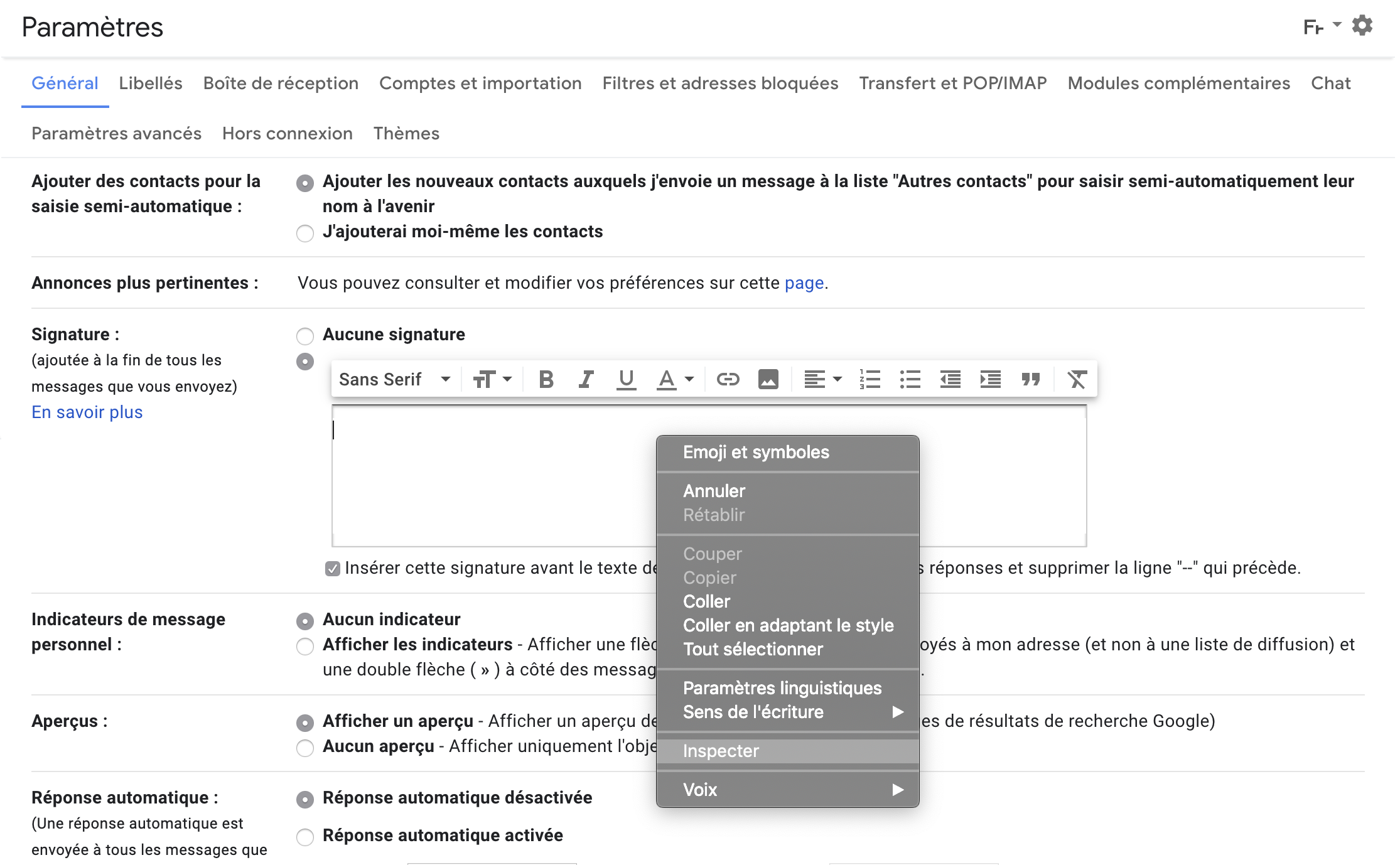 Pour que la signature se charge automatiquement à chaque ouverture de mail, sélectionnez-la dans le petit menu "Choisissez votre signature".